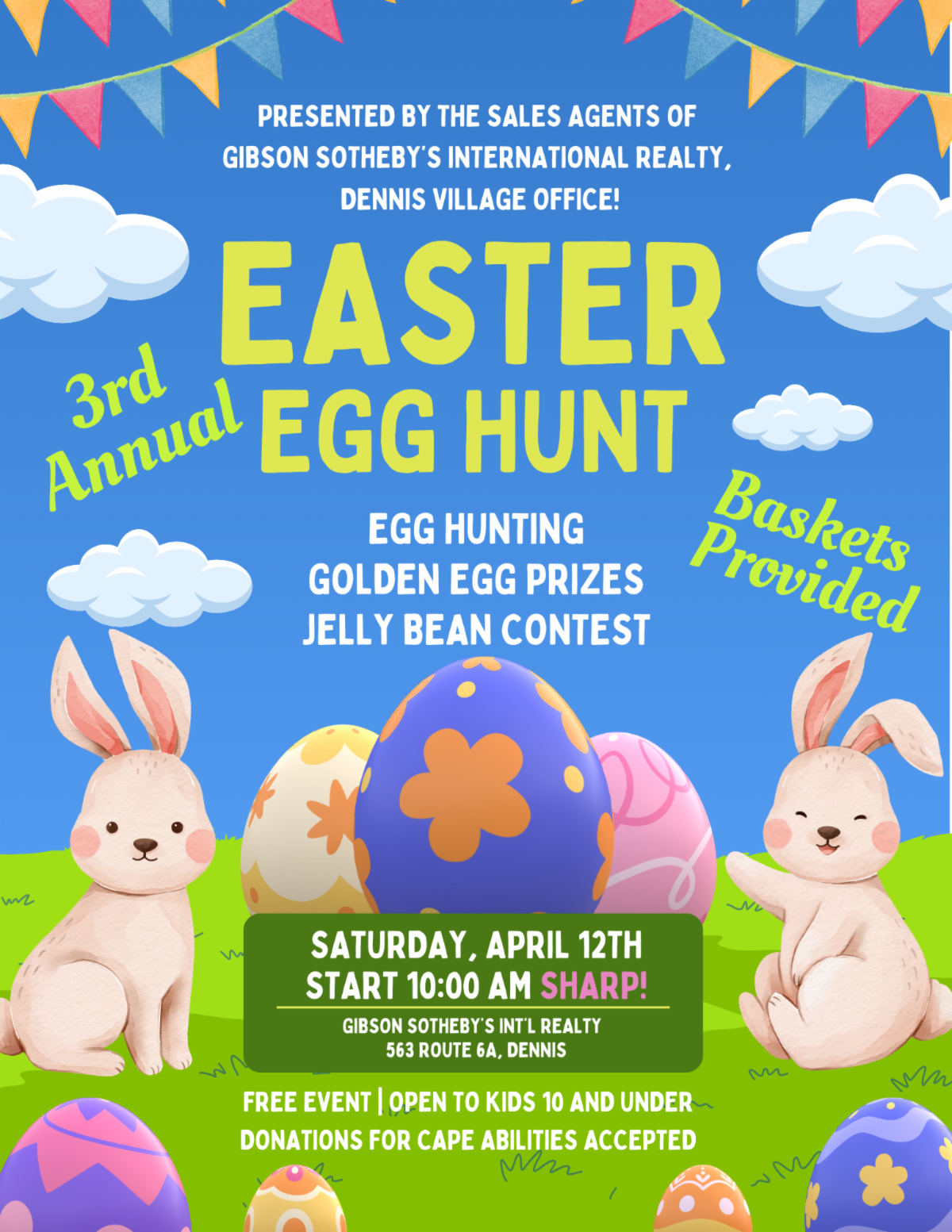 Open to kids 10 and under. This is a free event. Donations accepted for Cape Abilities. Featuring egg hunting, golden egg prizes, jelly bean contest. Baskets provided. Hunt begins at 10 am sharp!