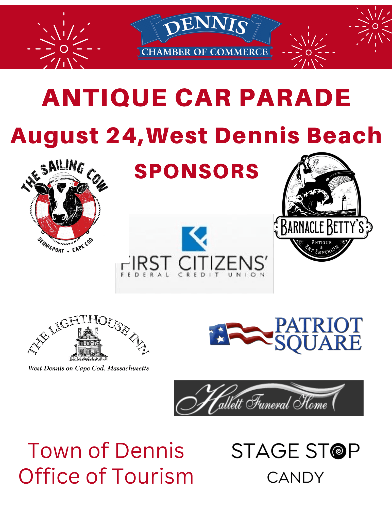 Show off your prized wheels and join us for a cruise from West Dennis through Dennis Port and South Dennis ending with hamburgers and hot dogs for sale at the Dennis Center for Active Living parking lot. Registration now open for classic cars and trucks pre-2000. Ribbons provided to all registrants which will serve as your entry. $15 per vehicle and $20 day of parade. Reminder: Dogs are not permitted at West Dennis Beach or in the parking lot. Download registration form here. Send in or drop off at the Dennis Chamber, 242 Swan River Road, West Dennis.