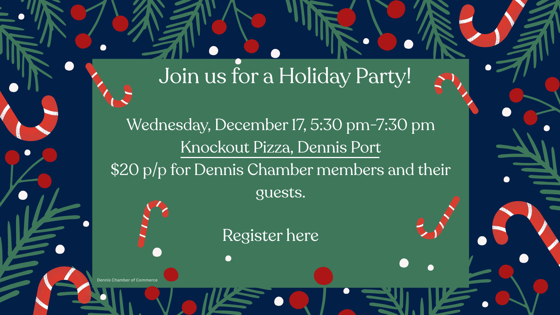 Dennis Chamber members and their guests are invited to jingle and mingle at our holiday celebration at Knockout Pizza in Dennis Port. Festivities start at 5:30 pm with a cash bar and a full buffet menu of salad, a variety of pizzas, garlic knots, wings and who doesn't like cake for dessert!